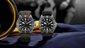A peça incorpora igualmente elementos específicos da marinha norte-americana para relógios de mergulhos, tais como as barras fixas e os braceletes de tecido num estilo puramente militar. Era comum a marinha norte-americana fornecer aos seus mergulhadores relógios da marca com braceletes em tecido, tipicamente de peça única feitas de nylons, de cor preta ou verde. Desta forma, as duas opções de braceletes do Pelagos FXD remetem para esta tradição de origem militar de equipar relógios com braceletes de tecido, mas com toque especial. A pulseira em tecido verde de peça única com filamento central vermelho e sistema de fecho de contato é a configuração principal do modelo, que conta também com uma pulseira adicional em borracha de peça única com tecido em relevo cinzento-escuro, reinterpretando assim este visual clássico com modernidade e sutileza.