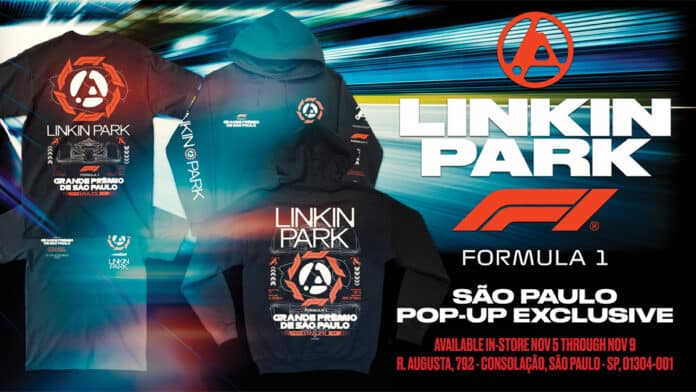 Com estampas que remetem ao Grande Prêmio de São Paulo, os fãs que visitarem a Pop Up Store da banda poderão adquirir um moletom ou uma camiseta que une o universo da Fórmula 1 a nova identidade visual do Linkin Park.