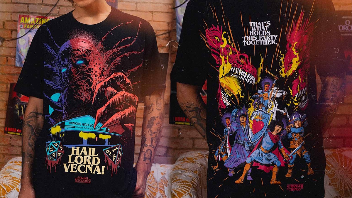 Outra camiseta exalta a soberania de Vecna, o grande vilão de Stranger Things, com elementos de RPG e a fachada da escola de Hawkins. E, para os amantes do clube de RPG Hellfire Club, a clássica camiseta de membro retorna agora em um estilo repaginado, com as mangas vermelhas e uma homenagem ao personagem Eddie Munson.