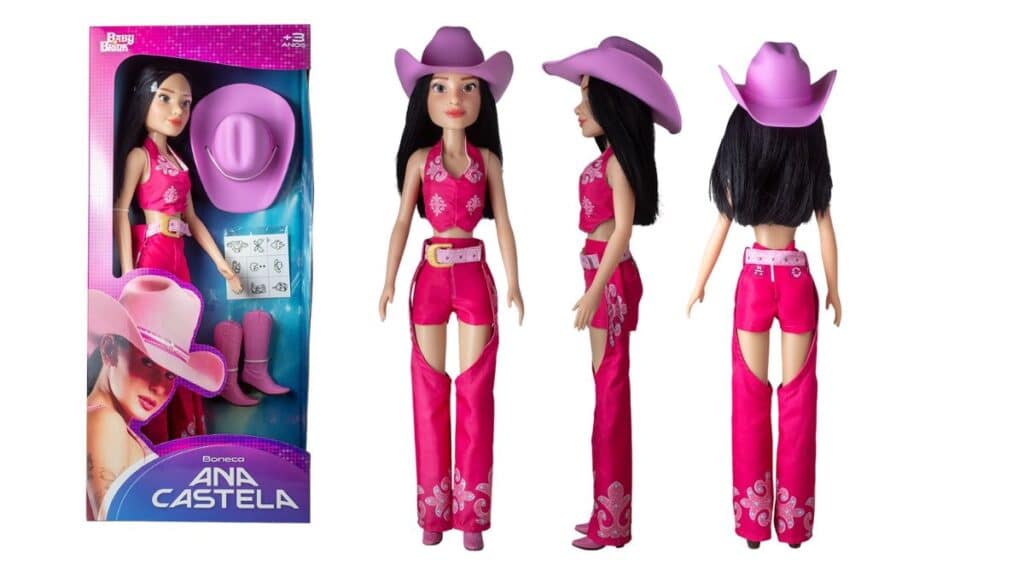 Com 55 cm e figurino completo, incluindo chapéu, botas e tatuagens adesivas, a boneca busca traduzir o estilo reconhecido de Ana Castela, que mantém forte diálogo com o público infantil e adolescente. O produto também chega para consolidar o nome da artista, já considerada um fenômeno nacional. Confira: