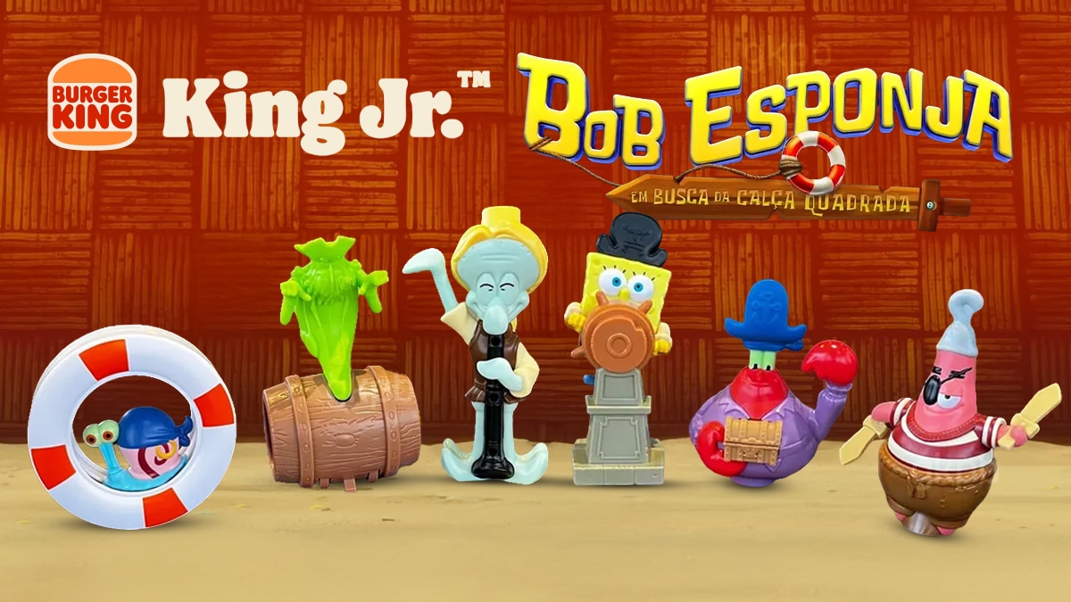 Ao todo serão seis brinquedos colecionáveis que estarão disponíveis para aqueles que comprarem o combo infantil do BK, são eles: Bob Esponja no Timão, Patrick Estrela Pirata, Lula Molusco e seu clarinete, Gary na boia de salva-vidas, o Holandês voador e o Seu Sirigueijo com um baú do tesouro. Cada um com seu próprio movimento interativo.