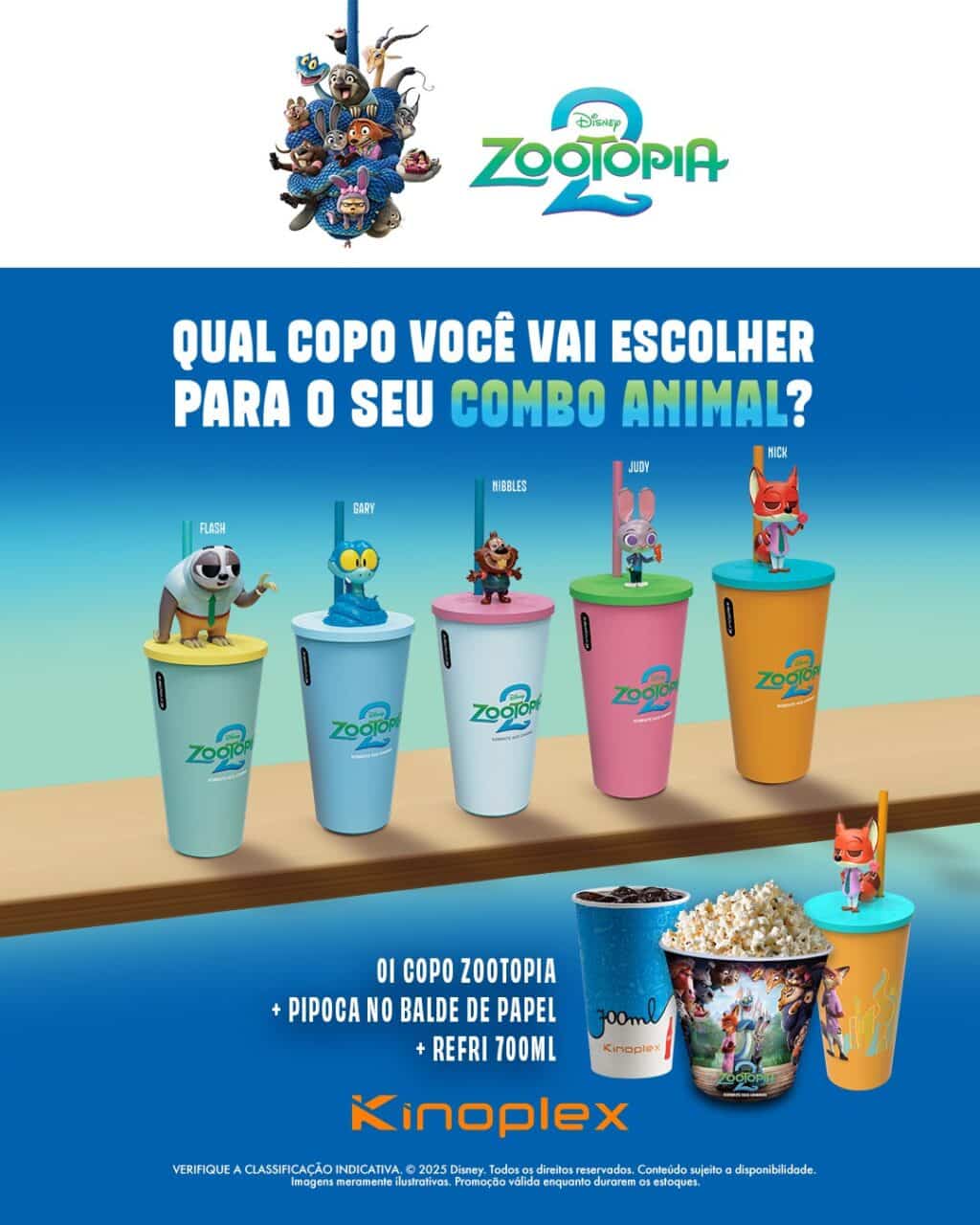 A Kinoplex, maior rede de cinemas 100% brasileira, anunciou que está trazendo uma seleção de copos colecionáveis para celebrar o lançamento de Zootopia 2, que estreia nesta quinta-feira, 27, em diversas exibidoras em todo o país.