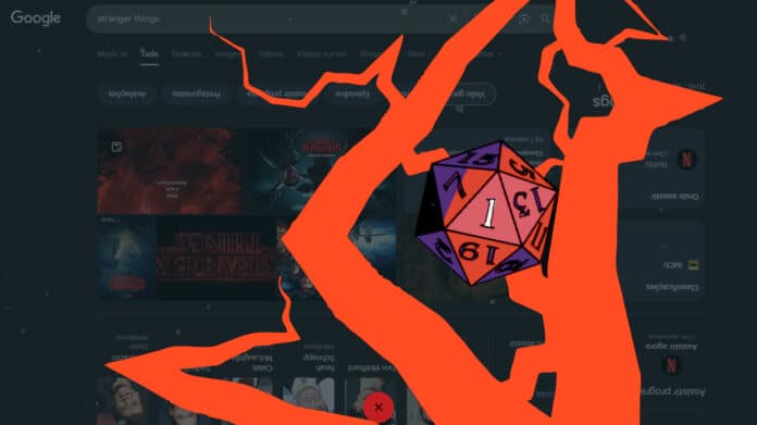 Para entrar no mundo invertido, basta pesquisar por “Stranger Things” no buscador. Em seguida, o usuário verá um d20 na parte de baixo da tela. Quando clicado, o d20 toma conta da tela, virando os resultados de cabeça para baixo e trazendo todo o aspecto do mundo invertido com esporos voando por entre os resultados. Veja: