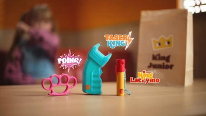 No filme, que imita o estilo de antigos comerciais de brinquedos, uma garotinha abre o seu combo King Jr. e, além dos tradicionais nuggets e batatas fritas, encontra itens inesperados: uma arma de choque de 200 mil volts, um soco inglês cor-de-rosa e um spray de pimenta. A cena busca reforçar a mensagem de que, para muitas crianças, a violência não é apenas um problema social distante, mas sim uma realidade presente no dia a dia de muitas delas. Confira: