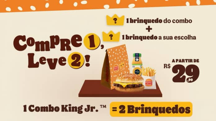 Na campanha chamada “Diversão em Dobro”, os clientes podiam levar dois brinquedos ao adquirir um Combo King Jr. junto de um Combo Regular. Agora, a mecânica foi simplificada: basta comprar um único combo King Jr., a partir de R$ 29,90, para receber os dois brinquedos. Em sua publicação no Instagram, o Burger King não revelou quais seriam os brinquedos disponíveis.