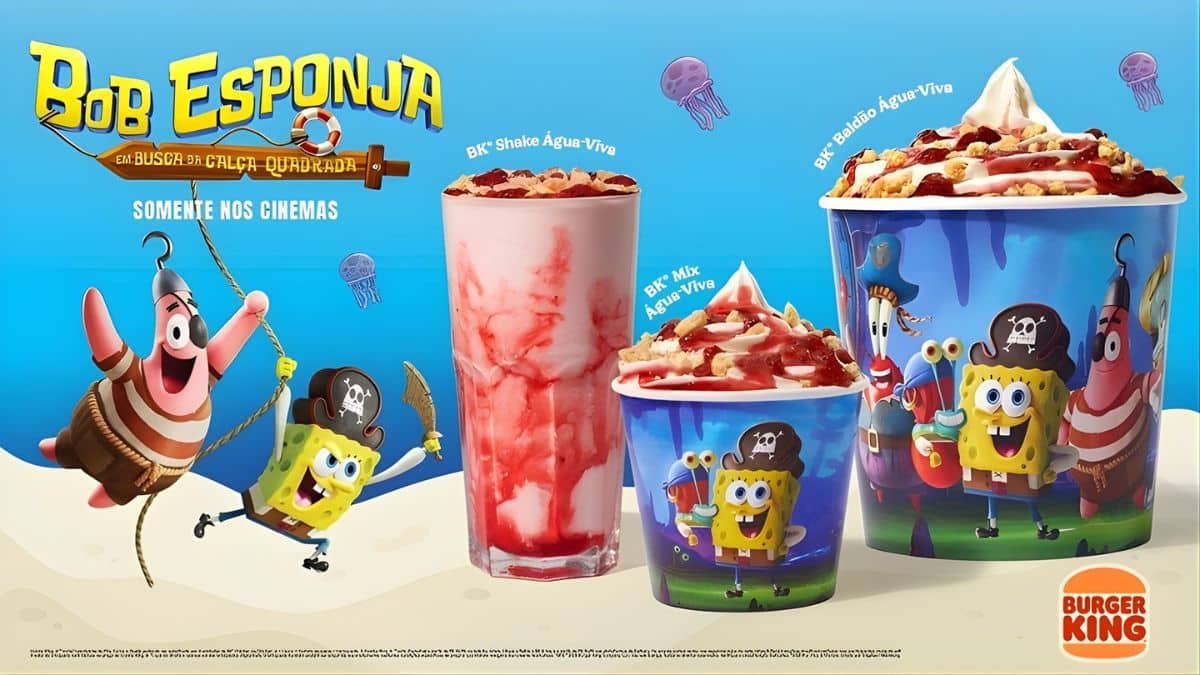 A linha de sobremesas inspiradas em Bob Esponja apresenta três lançamentos. O BK Shake Água-Viva combina calda de morango, farofa de cookies e massa de baunilha. Já o BK Mix Água-Viva traz calda de morango, forafa de cookies e massa de baunilha. Para finalizar, o BK Baldão Água-Viva oferece uma porção maior do BK Mix. Confira: