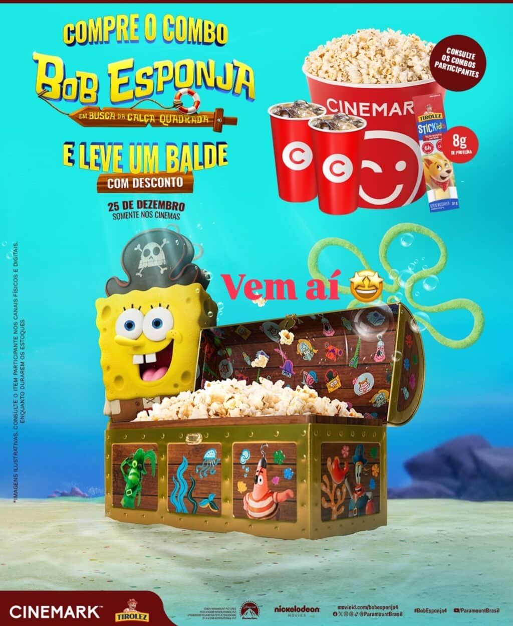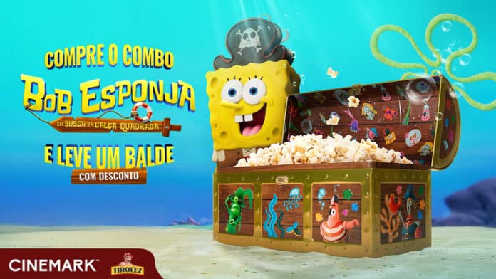 A Cinemark entrou no clima da estreia de Bob Esponja: Em Busca da Calça Quadrada, que chega aos cinemas nacionais no dia 25 de dezembro. Para marcar o lançamento, a rede anunciou nesta quinta-feira, 11, em seu perfil oficial no Instagram, um item especial para os fãs da animação: um balde de pipoca em formato de baú.