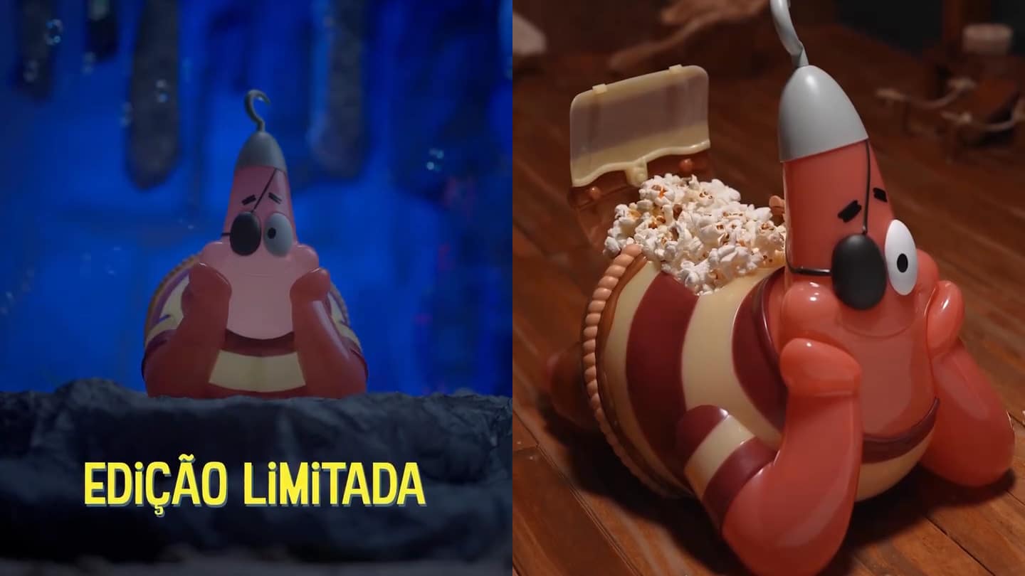 No final do ano passado nós falamos aqui do balde de pipoca no formato de baú lançado pelo Cinemark para celebrar o lançamento de Bob Esponja: Em Busca da Calça Quadrada. Pouco tempo depois, falamos também que a rede Cinépolis estava trazendo diferentes copos temáticos para o lançamento do filme. Ainda na ocasião, os consumidores perguntaram sobre o lançamento de um balde e a rede deixou um certo mistério no ar. Pois bem, o mistério chegou ao fim com o lançamento do balde de pipoca inspirado no personagem Patrick Estrela.