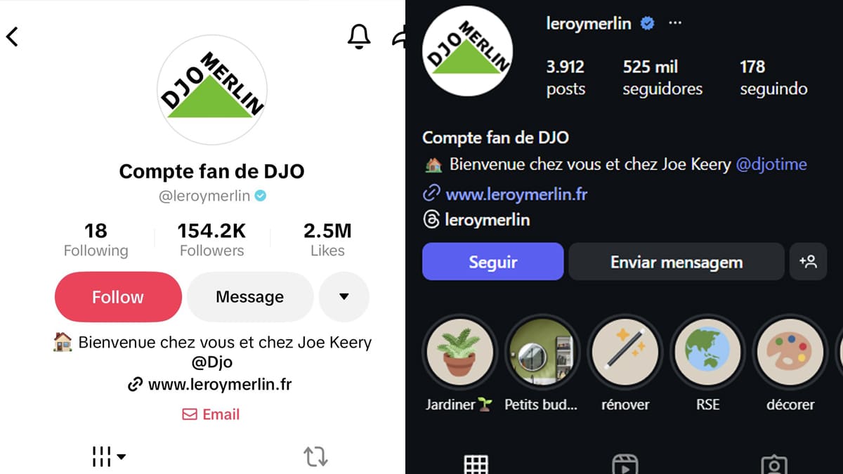 - Nome do perfil: O tradicional “Leroy Merlin” foi substituído por “Compte fan de DJO” (Conta fã de DJO), invertendo completamente os papéis e assumindo a posição de admiradora do artista;