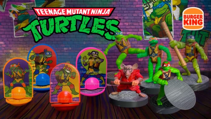 As Tartarugas Ninja Michelangelo, Raphael, Donatello, Leonardo e o Mestre Splinter deixaram a pizza de lado neste mês de janeiro e chegaram no Burger King como brindes para os combos do King Jr.