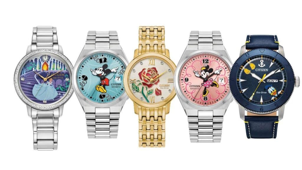 A linha traz modelos que homenageiam ícones atemporais da Disney como Mickey Mouse, Minnie Mouse, Pato Donald, Pluto e as famosas Princesas Disney. Os acabamentos variam entre caixas de aço inoxidável prateado, dourado ou rosê, pulseiras em couro ou aço, mostradores com madrepérola, efeitos sunray, aplicação de cristais e ilustrações exclusivas licenciadas pela Disney. Confira: