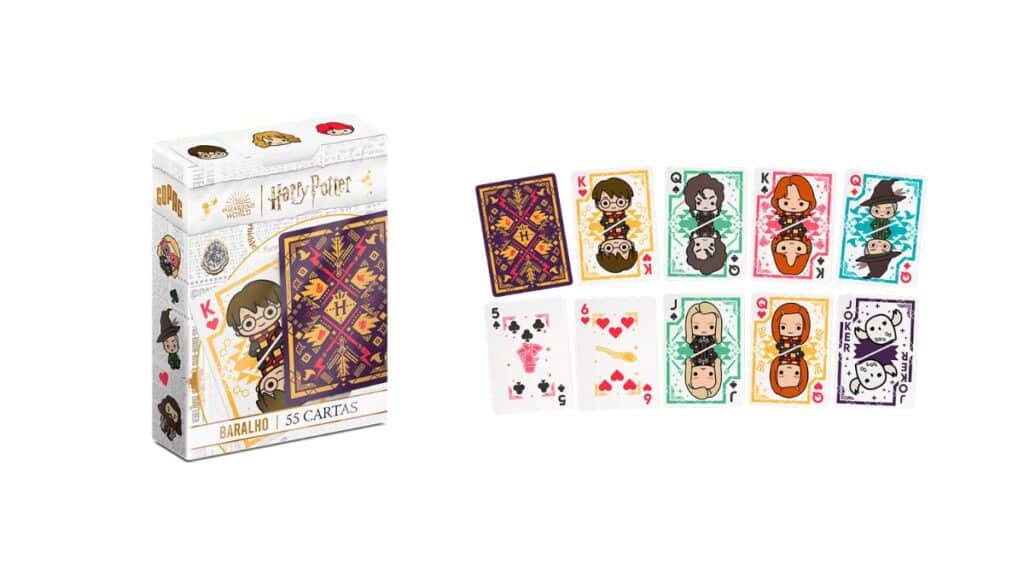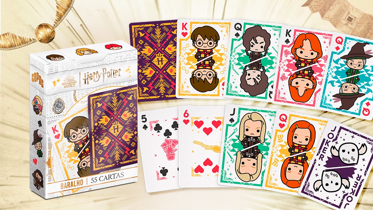 De caráter colecionável, cada carta traz a essência única do universo de Harry Potter que tornaram a saga tão inesquecível. Inspiradas nas ilustrações icônicas no baralho single deck, as cartas transportam os jogadores para uma Escola de Magia de Hogwarts, proporcionando uma experiência mágica a cada rodada. Já no double deck, os jogadores se deparam com as fotos dos personagens nos filmes. Confira: