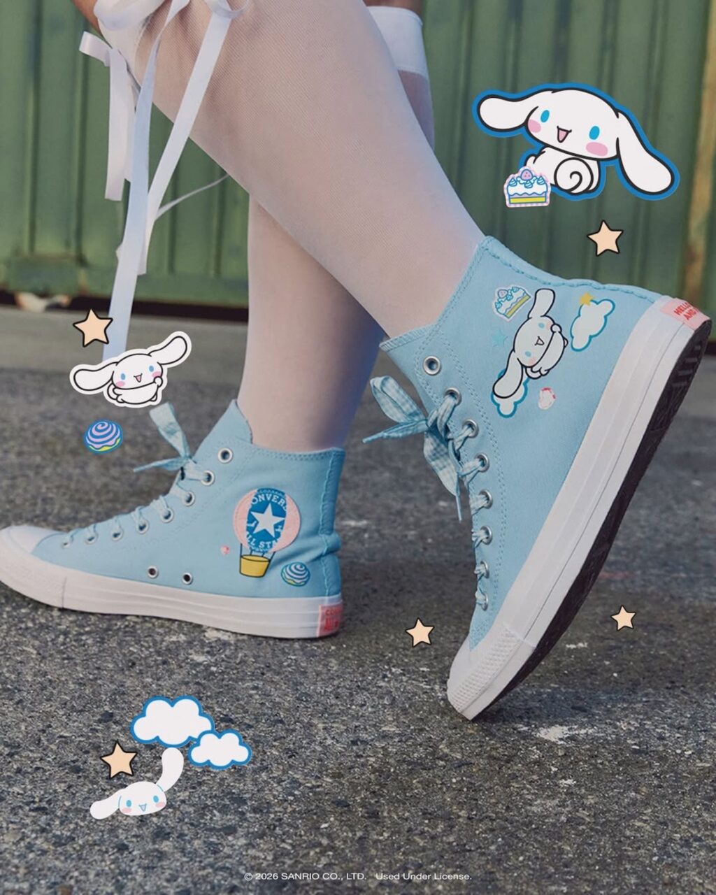 Entre os personagens presentes estão Hello Kitty, Kuromi, My Melody e Chococat, mas o Cinnamaroll ganha um tratamento especial: um par exclusivo com a parte superior do tênis em azul claro, a cor característica da personagem, complementada por detalhes em rosa nas logos e nas plaquinhas do calcanhar.