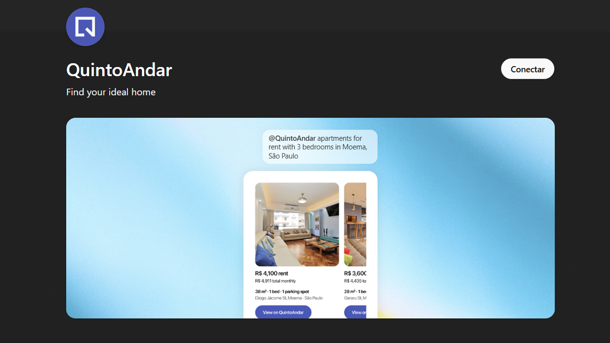 Para utilizar o aplicativo do QuintoAndar, os usuários devem acessar a aba “Aplicativos” dentro da plataforma do ChatGPT, pesquisar por “QuintoAndar” e ativar o aplicativo. A partir de então, o ChatGPT estará habilitado a consultar os anúncios disponibilizados pelo app para responder a perguntas sobre busca de imóveis. Basta iniciar uma mensagem com /QuintoAndar e construir o prompt. As informações de imóveis disponíveis em tempo real serão disponibilizadas via carrossel. Ao encontrar uma opção de interesse, basta clicar em “Ver mais” para ser redirecionado automaticamente à plataforma onde poderá agendar visitas e iniciar o processo de locação ou compra.