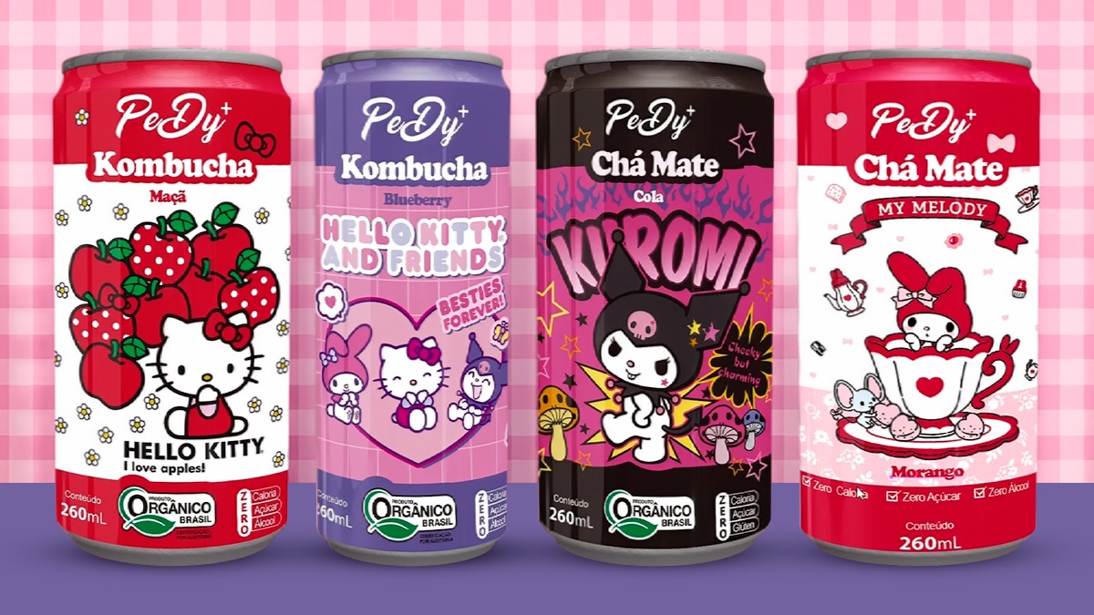 O lançamento apresenta quatro novos rótulos em edição especial, que unem o universo kawaii e colecionável da Sanrio à proposta da PeD de oferecer bebidas orgânicas, saborosas e com identidade inovadora. Entre as novidades estão Chá Mate Cola (Kuromi), Chá Mate Morango & Limão Siciliano (My Melody), Kombucha Blueberry (Hello Kitty and Friends) eKombucha Maçã (Hello Kitty). Confira: