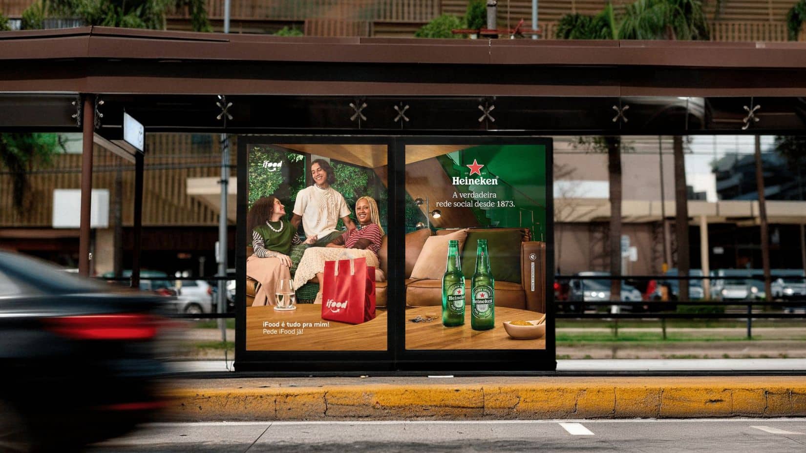 A proposta convidou marcas parceiras, como iFood e Misci, a ocuparem painéis instalados lado a lado com a Heineken A partir de uma mesma fotografia, o layout é dividido em dois anúncios complementares: de um lado, a Heineken; do outro, a marca convidada. Assim, o encontro entre as marcas acontece no espaço urbano, diante de quem passa.