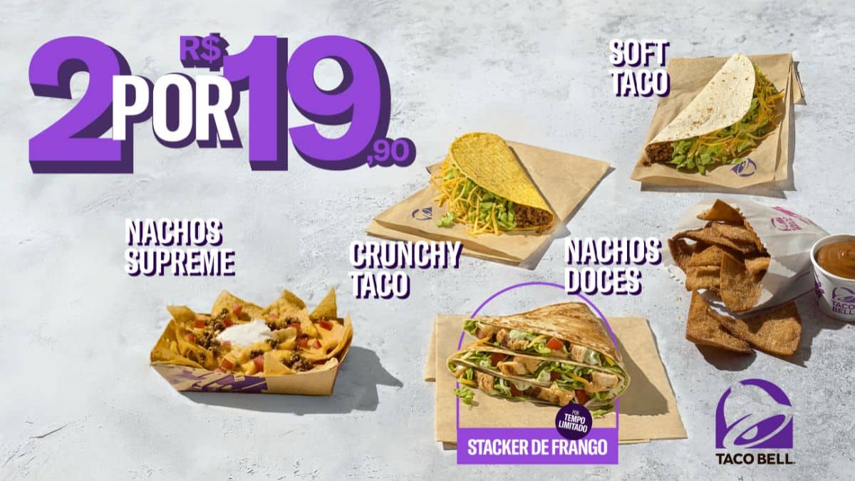 Além da novidade, a promoção de 2 por R$ 19,90 oferece outros ícones do cardápio: o Soft Taco e o clássico Crunchy Taco, preparados com proteína, mix de queijo e alface, que permitem escolher a tortilla macia ou crocante, além do Nachos Supreme, acompanhado de carne moída, nacho cheese, sour cream e tomate. Para a sobremesa, os Nachos Doces com doce de leite, polvilhados com açúcar e canela. O Stacker de frango ficará disponível no menu por apenas seis semanas em todas as lojas físicas da rede.