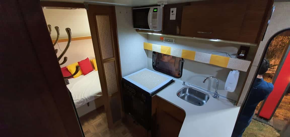 O trailer fica localizado dentro do mesmo terreno do restaurante que funcionará 24h. Conta com um espaço tipo “sala-cozinha” e um quarto com uma cama de solteiro. A cozinha é equipada com geladeira, fogão, microondas, armários e pia. Já a área da sala possui uma mesa central com bancos em volta e também há um banheiro. Confira imagens: