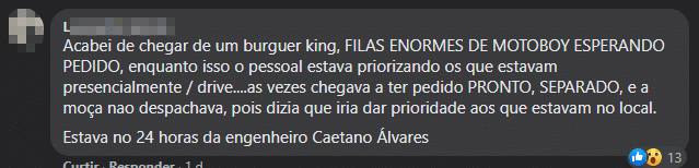 Por outro lado, não são apenas os consumidores que estão sendo prejudicados com essa promoção. Os entregadores de aplicativo e os próprios funcionários do Burger King estão enfrentando diversos problemas com o “BK Na Madruga”. Imagens e mensagens de entregadores nas redes sociais e nos aplicativos de delivery denunciam diversas aglomerações dentro das lojas enquanto aguardam o pedido.