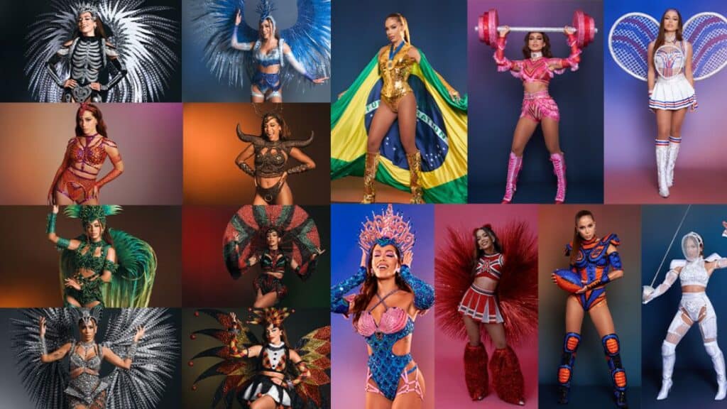 A vibrant collage of Anitta’s iconic carnival outfits, showcasing a variety of colorful and themed looks.